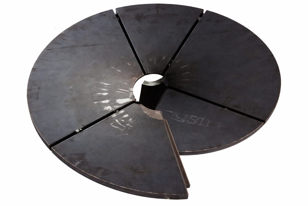 We plasma-cut and press-form CNC-nested plate blanks into 360° segments up to 150 in OD and 2 in thick.